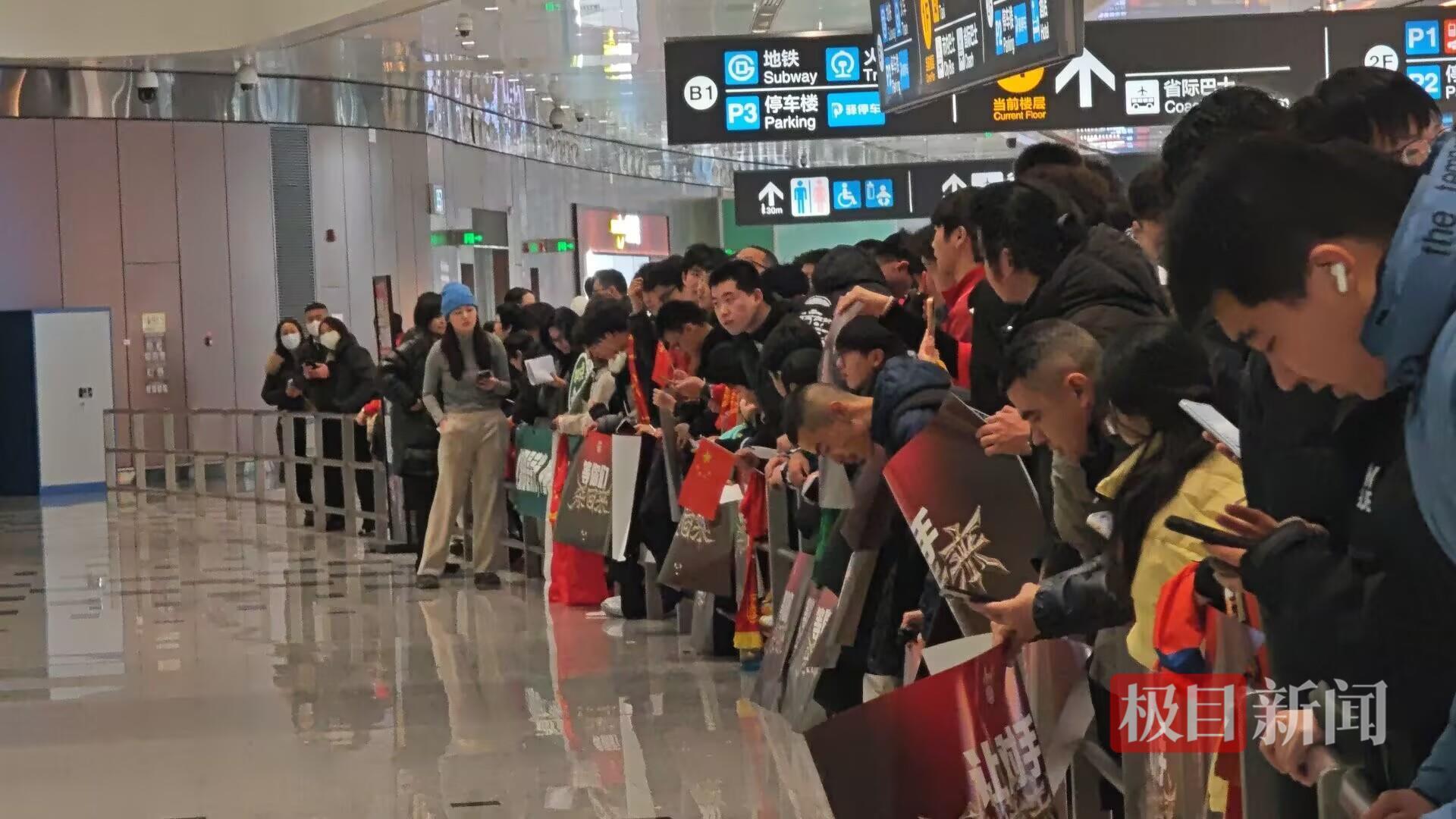 25日下午1时40分左右,距离中国队抵达时间还有一小时,极目新闻记者看到,已有球迷身着“中国红”应援服等候至大兴国际机场一层国际到达的出口。也有球迷拿着笔记本、球员海报,希望能得到喜欢球员的签名。
